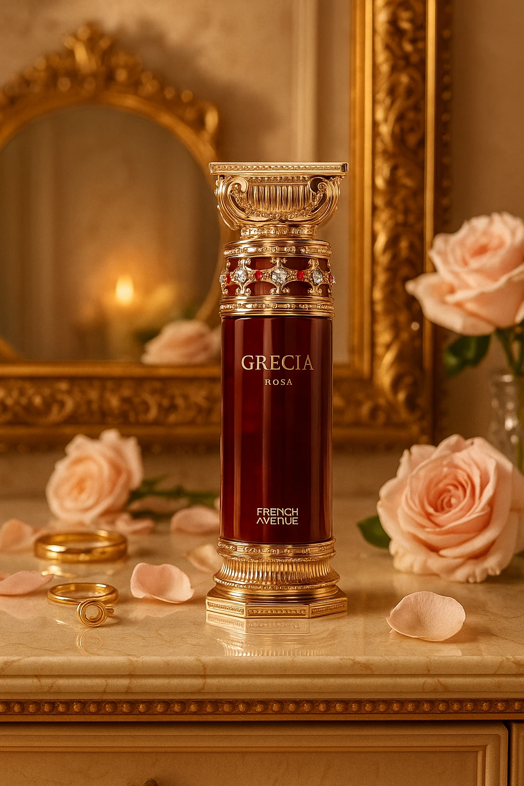 Grecia Rosa es una fragancia que celebra la feminidad eterna y el arte del perfume árabe.